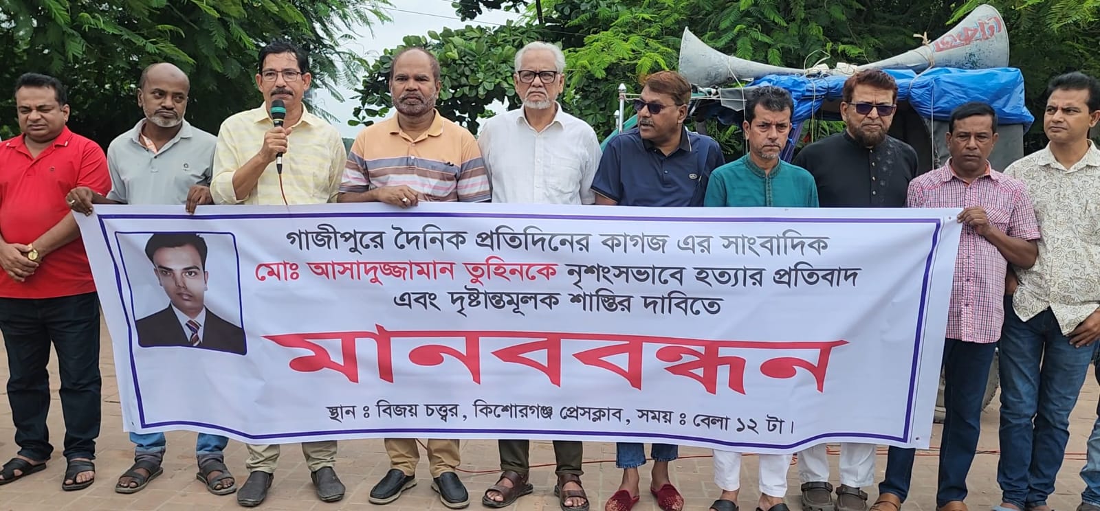 গাজীপুরে সাংবাদিক আসাদুজ্জামান তুহিন হত্যার প্রতিবাদ ও দৃষ্টান্তমূলক শাস্তির দাবিতে মানববন্ধন করেছে কিশোরগঞ্জ প্রেসক্লাব