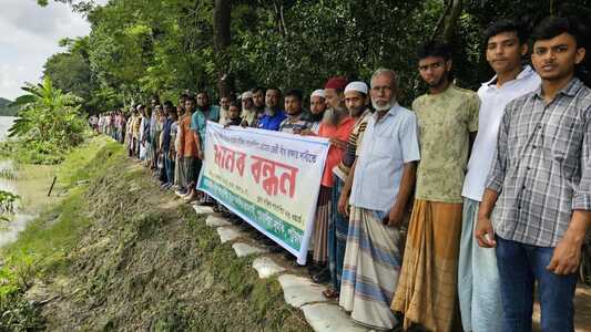 দুমকিতে নদী ভাঙনে ঝুঁকিতে বেড়িবাঁধ টেকসই মেরামতের দাবিতে মানববন্ধন