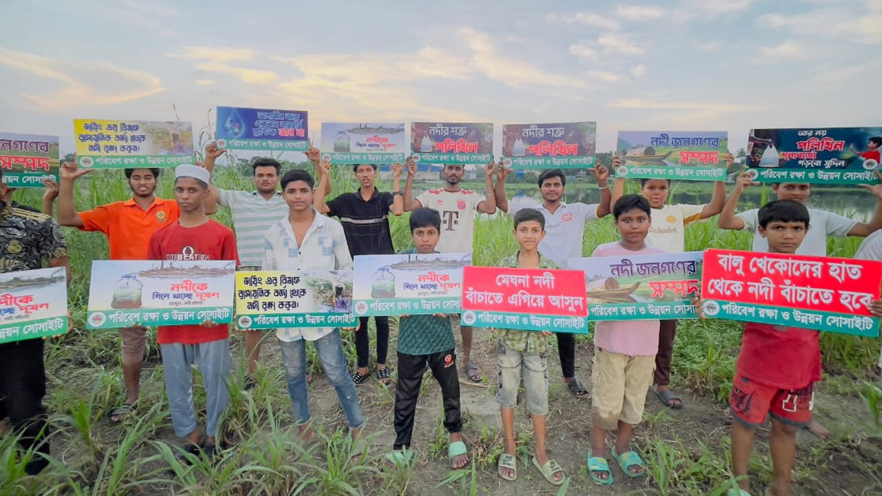 ‘আমার নদী, আমার মা— দূষণ হতে দেব না’ স্লোগানে নারায়ণগঞ্জের সোনারগাঁ-বন্দর সীমান্তবর্তী ব্রহ্মপুত্র নদে দূষণ ও দখল বিরোধী মানববন্ধন করেছে