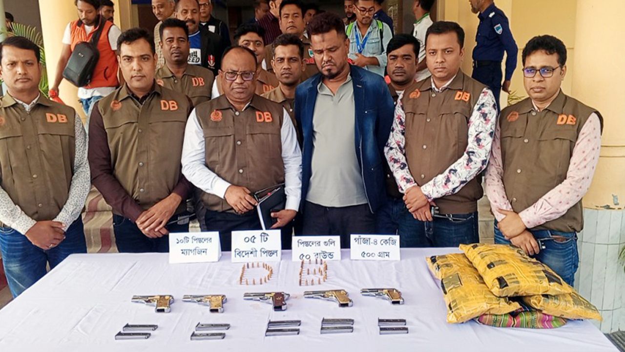 যশোর সদর উপজেলার নওয়াপাড়া ইউনিয়নের মধুগ্রাম এলাকায় পাঁচটি বিদেশি পিস্তল, ১০টি ম্যাগাজিন, ৫০ রাউন্ড গুলি এবং ৪ কেজি ৫০০ গ্রাম